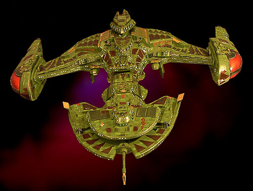 | VuLK'TaR Class Klingon Capital Cruiser A massive vessel sharing some lineage the NehG'Var class warships, the VuLK'TaR is a giant vessel, nearing the size of a Romulan Warbird. It sports massive nacelles and menacing disruptor cannons fore and aft. She was the inspiration of particularly self-absorbed house, the house of Q'ijTal, a powerful but vain and ambitious member of the ruling Council. It cost a significant portion of the house's wealth to build it's ornate and overbuilt Capital Ship. Massive warp nacelle power weapons systems and an effective cloaking system. It takes a great deal of energy to cloak as large a warp signature and power emissions, and this ship has an efficient system to balance power and invisibility. IMAGES: Scroll down to view holoimages of the vessel. Model notes follow below. THIS MODEL IS NOT CURRENTLY AVAILABLE FOR SALE. IT HAS ALREADY BEEN SOLD TO A COLLECTOR. SEE THE CONTACT PAGE FOR INFORMATION ON PURCHASING ONE OF MY OTHER CREATIONS. |